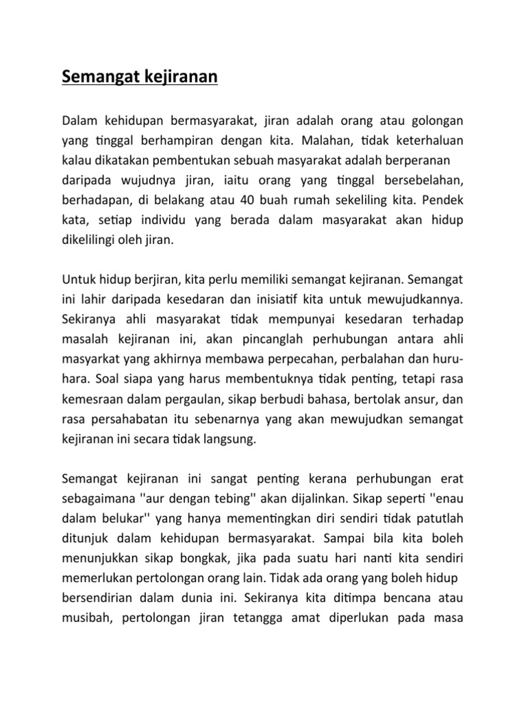 Kesannya semangat kejiranan dapat dipupuk antara jiran dalam kalangan anak-anak dan ibu bapa sekali gus dapat mewujudkan masyrakat yang harmoni. Walaupun pepatah Melayu ada mengatakan bahawa berat mata memandang berat lagi bahu memikulnya namun sebagai jiran kita mestilah berpegang pada prinsip cubit paha. Karangan Bahagian B Kertas 1 Soalan.